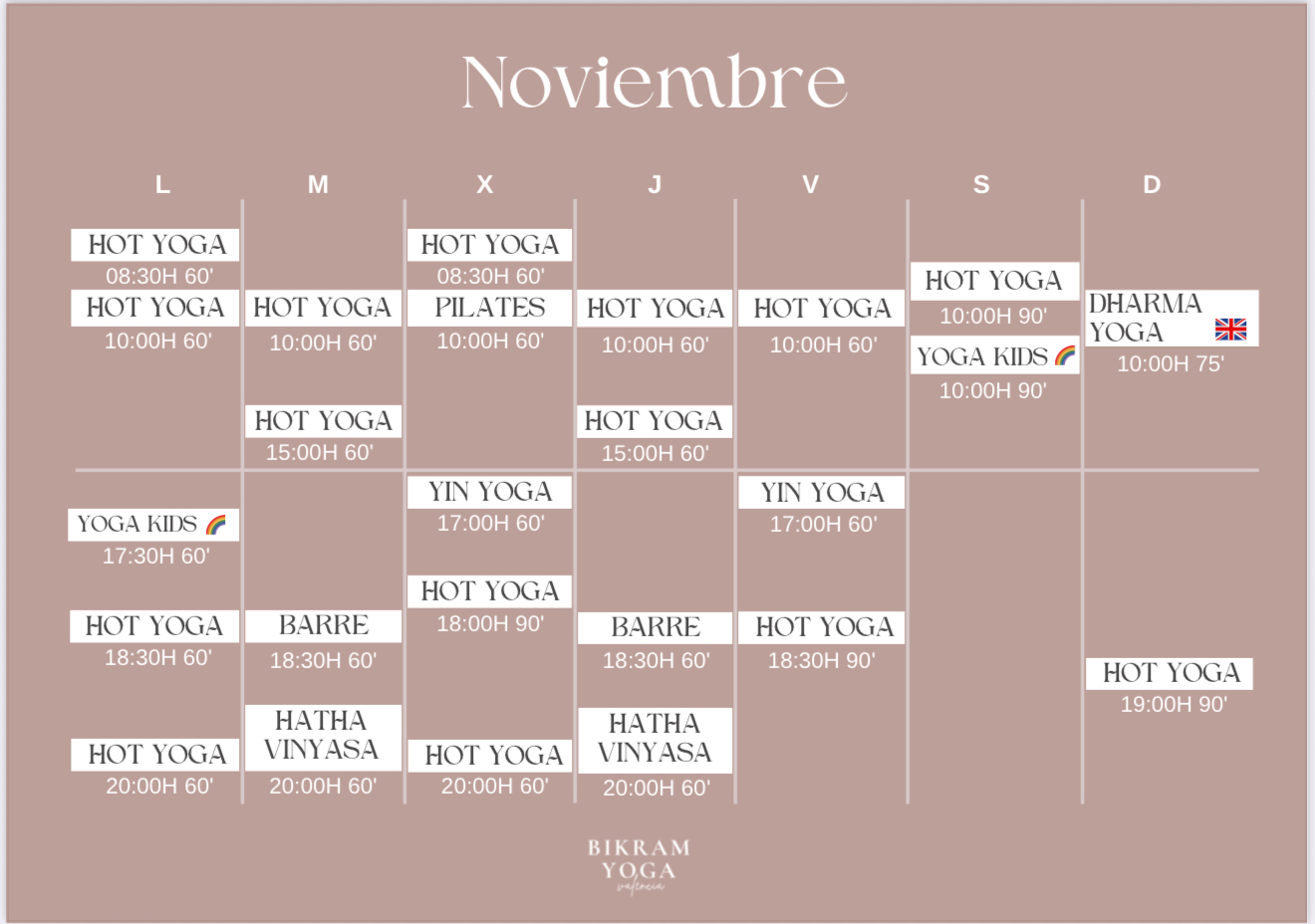 Practica yoga cuando quieras: abrimos de lunes a domingo, con clases de Bikram (Hot Yoga), Vinyasa, Hatha, Yin Yoga y más.